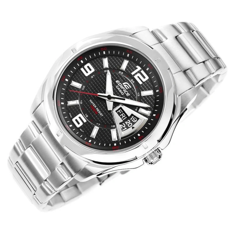 Výběrem tohoto modelu CASIO EDIFICE získáváte špičkové pánské hodinky, které splňují ta nejvyšší očekávání. Moderní uspořádání s vroubkovaným černým ciferníkem doplněným datumovkou a červenými detaily podtrhuje dynamický charakter hodinek a spojuje funkčnost s jedinečným designem. Vodotěsnost 10 BAR vám umožní být ve vodě svobodní, zatímco fluorescenční podsvícení zajistí viditelnost i po setmění. Logo EDIFICE vyražené na korunce, zadním krytu a sponě.