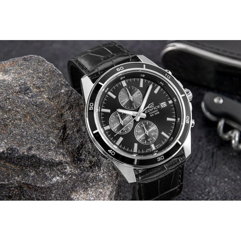 Standardní chronograf EDIFICE střední velikosti. Díky univerzálnímu charakteru hodinek a černému koženému řemínku se celek hodí jak k ležérní, tak sportovní eleganci. Jsou vybaveny funkcemi dne v měsíci a chronografy: stopky na 1/10 sekundy, vteřinová ručička, minutová ručička. Díky vodotěsnosti 10 BAR si je můžete bez obav vzít k bazénu, na trénink nebo za vodním dobrodružstvím. Fluorescenční podsvícení vám umožní plnou kontrolu času i ve tmě.