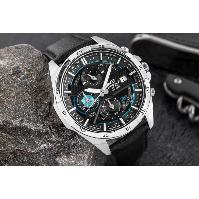 Velký standardní chronograf EDIFICE, jehož hlavním rysem je dynamický design dvouvrstvého trojrozměrného ciferníku. Kombinace černé barvy s modrými kovovými detaily na ciferníku dodává hodinkám elegantní a zároveň sportovní vzhled. Hodinky jsou vybaveny funkcemi dne v měsíci a chronografy:stopky vteřin, minut a chronograf 24 h. Díky vodotěsnosti 10 BAR si je můžete bez obav vzít do bazénu, na trénink nebo za vodním dobrodružstvím a fluorescenční podsvícení vám umožní plnou kontrolu času i ve tmě.