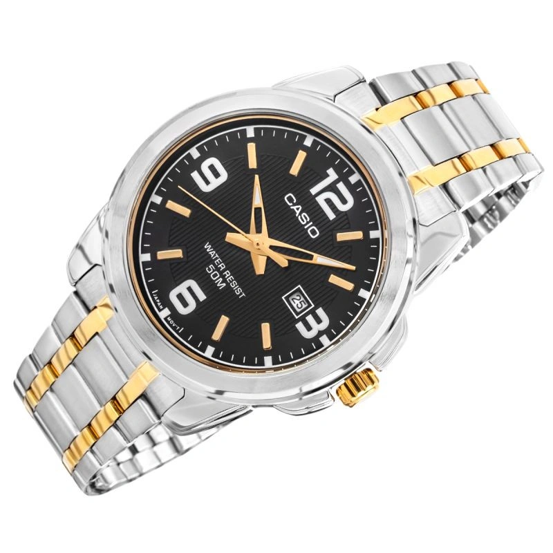 Pánské hodinky CASIO MTP-1314SG-1AVDF představujídokonalou rovnováhu mezi elegancí a každodenní funkčností.černý ciferník s jemnými drážkami ve svislých liniích dodává hodinkám hloubku a charakter, zatímco zlaté ručičky a indexy dokonale kontrastují s pozadím a nabízejí skvělou čitelnost.velké arabské číslice na 12, 3, 6 a 9 hodinách dodávají hodinkám moderní nádech, zatímco vestavěná datumovka decentně dotváří vzhled.náramek z kombinace nerezové oceli a zlatých akcentů vytváří harmonickou kompozici, která se stejně dobře hodí k saku i každodennímu městskému stylu.pouzdro s klasickými proporcemi a vodotěsností do 50M jsou zárukou pohodlí a odolnosti v každé situaci.Casio MTP - pro muže, kteří vědí, že nejlepší kombinace jsou ty nadčasové.