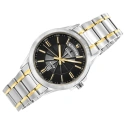 Trojrozměrný černý ciferník zdobený přesnými indexy a elegantními ručičkami vyzařuje výraznou třídu, která přitahuje pozornost a zdůrazňuje charakter nositele. Ciferník je vybaven okénkem s dnem v týdnu, které je zobrazeno v angličtině, což mu dodává mezinárodní charakter a styl. Pod ním se nachází také samostatné okénko s aktuálním datem.