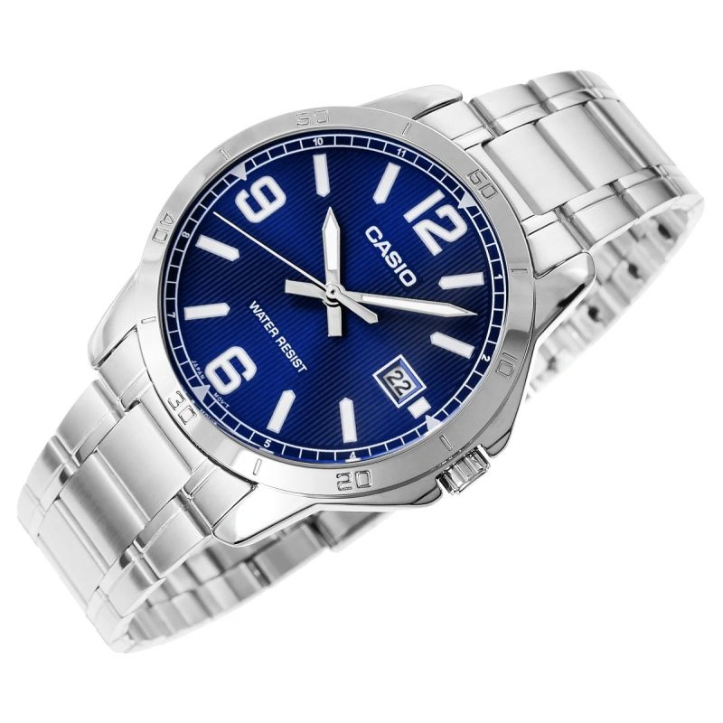 Zvolte sportovní eleganci s klasickými analogovými hodinkami CASIO s minutovou stupnicí na rámečku. Ciferník hodinek upoutá pozornost intenzivním, sytě modrým odstínem, který je obohacen jemnou strukturou svislých proužků. Tento texturní efekt nejenže dodává eleganci, ale také umožňuje dynamický odraz světla od povrchu a vytváří dojem hloubky. Výrazné indexy, datumovka a masivní ocelový náramek doplňují vzhled a spojují funkčnost s mužným stylem. Minutová stupnice na rámečku dodává dynamický nádech a osvědčí se při každodenním měření času. Bonusem je voděodolnost (WR), takže se nemusíte obávat kontaktu s deštěm nebo vodou při každodenních aktivitách.