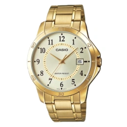 Pánský model z kolekce CASIO, který se vyznačuje klasickým 40milimetrovým pouzdrem a náramkem z nerezové oceli, potaženým odolnou zlatou iontovou vrstvou. světlý ciferník s přehlednými černými arabskými číslicemi zajišťuje vynikající čitelnost, zatímco dodatečná minutová stupnice ve vnitřním rámečku usnadňuje orientaci v čase. praktická datumovka umístěná na 3. hodině poskytuje rychlý přehled o aktuálním dni v měsíci. vodotěsnost na úrovni WR (Water Resist) znamená, že hodinky lze bez obav nosit každý den - například při mytí rukou nebo za deštivého počasí. hodinky pohání přesný quartzový strojek, který zaručuje spolehlivý chod.