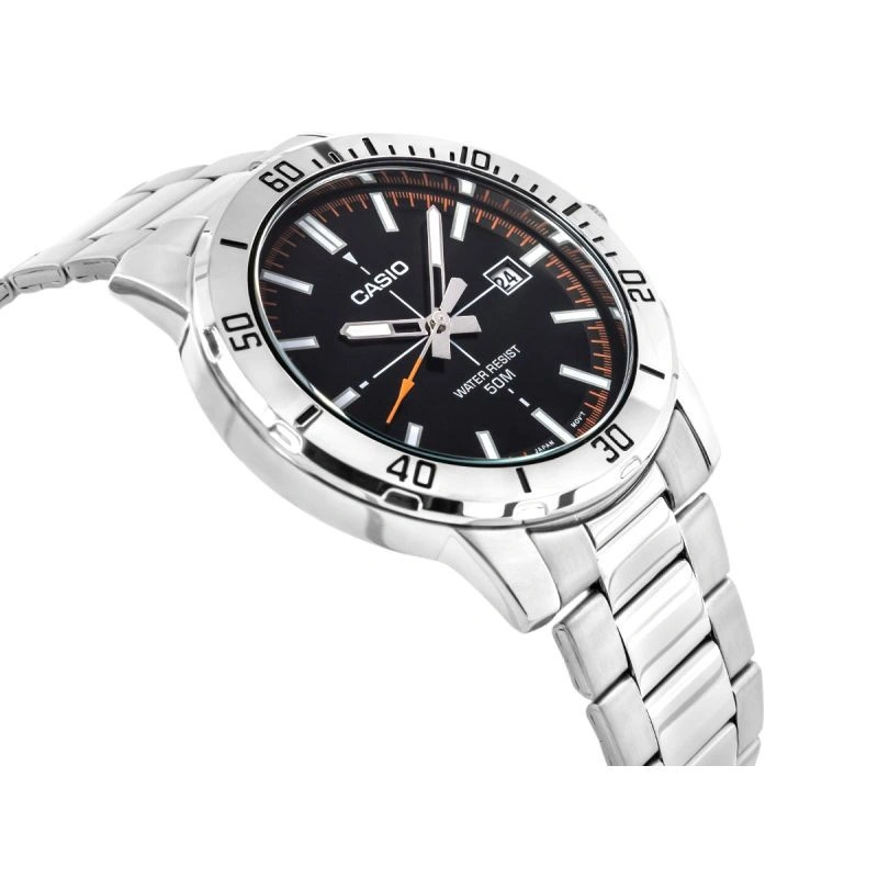 Klasický model CASIO, který vyniká robustním 44milimetrovým pouzdrem z nerezové oceli a černým ciferníkem s dynamickými oranžovými akcenty, které mu dodávají energický, mužný charakter.Přehledné indexy a pevné ručičky zajišťují dokonalou čitelnost v každé situaci - od ranního běhu až po pozdní obchodní schůzku.Praktická datumovka na 3. hodině a vodotěsnost 50M činí z těchto hodinek ideální volbu pro každý den - bez ohledu na počasí a životní styl.Díky ocelovému náramku s klasickým trojitým zapínáním spojuje tento model eleganci s každodenní funkčností.Hodinky poháněné přesným quartzovým strojkem jsou vhodné pro muže, kteří oceňují praktičnost, odolnost a moderní vzhled.