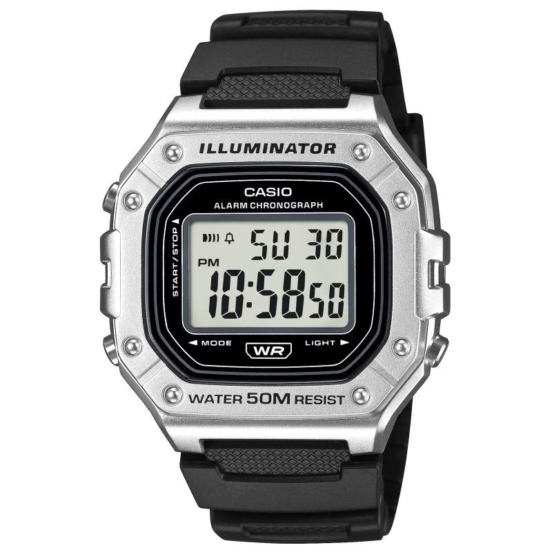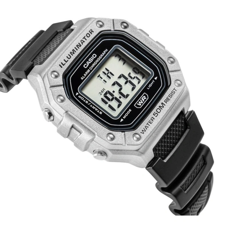 Casio W-218HM-7AVDF to esencja klasycznego stylu Casio w nowoczesnym, sportowym wydaniu: wyrazisty, prostokątny wyświetlacz LCD w solidnej kopercie, czytelny na pierwszy rzut oka, z subtelnymi akcentami, które dodają mu świeżości i uniwersalności. Zegarek został stworzony do codziennego tempa: wodoszczelność 50 m, podświetlenie LED dla pewnego odczytu po zmroku, 7-letnia bateria dla długiej niezawodności, a także praktyczny zestaw funkcji – stoper 1/100 s (do 60 min), alarm dzienny i sygnał pełnej godziny, automatyczny kalendarz oraz format 12/24 h. Lekki i wygodny,zszkiełkiem z tworzywa (Resin Glass) i wytrzymałym paskiem z żywicy, świetnie sprawdzi się zarówno na treningu, jak i w codziennych stylizacjach. Jeśli szukasz bezkompromisowej prostoty połączonej z legendarną trwałością Casio, W-218HM-7AVDF będzie strzałem w dziesiątkę.