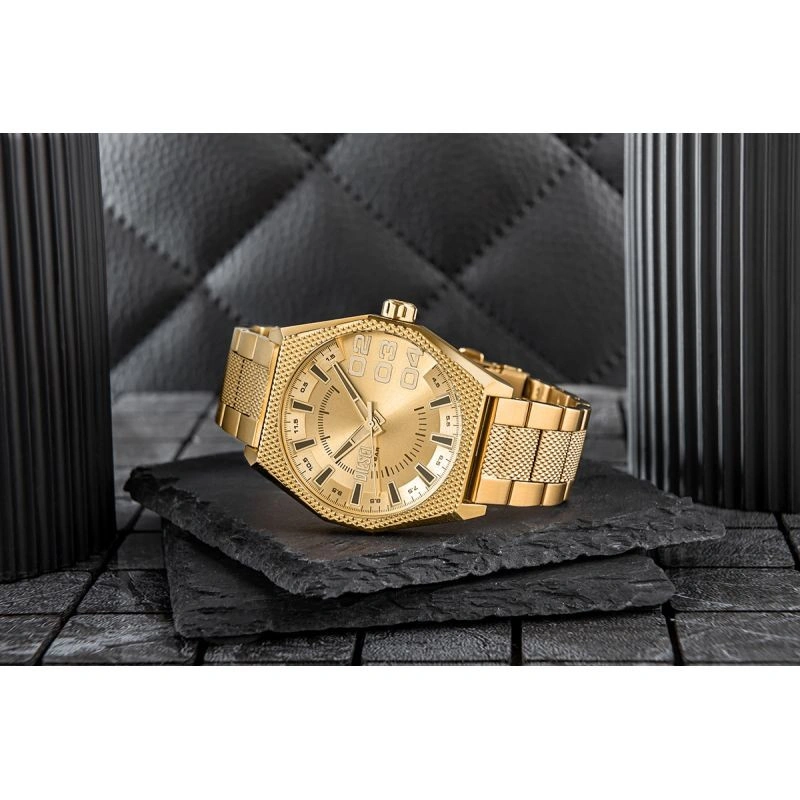 Hodinky Diesel Scarper DZ2173 jsou hodinky, které upoutají pozornost a vzbudí respekt. Jejich zlatý šestihranný plášť a masivní náramek vyzařují dominanci a vytvářejí doplněk, který řekne víc než tisíc slov. Každý detail - od gravírované textury až po trojrozměrné číslice na ciferníku - podtrhuje jejich strohou, ale luxusní estetiku.