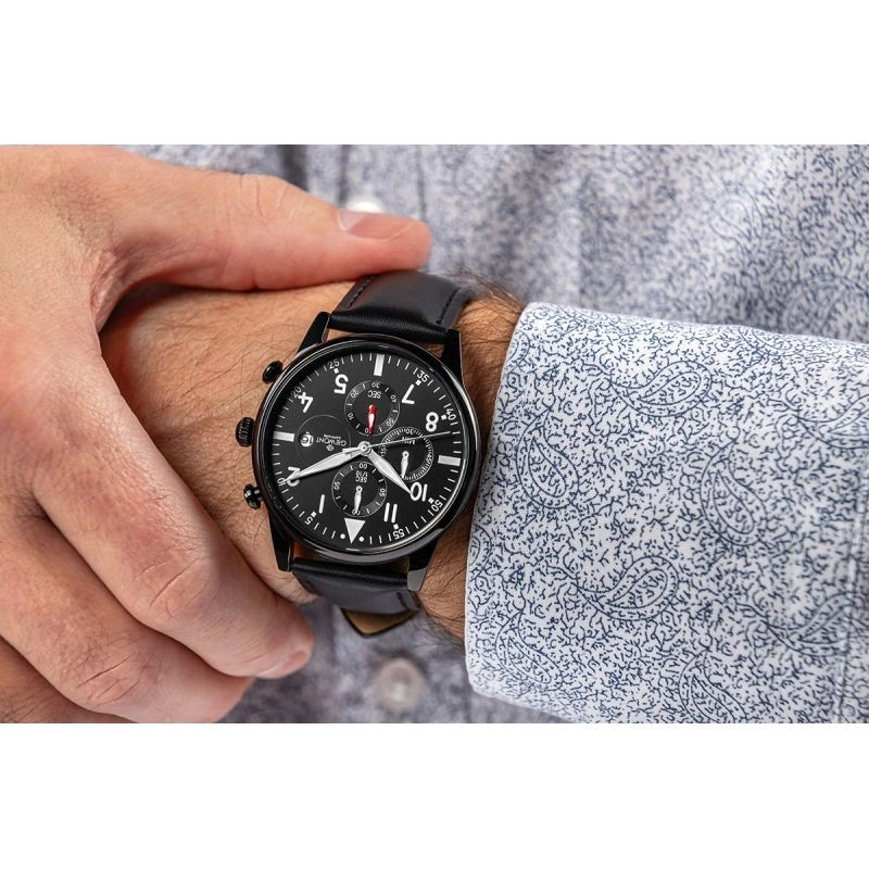 Zegarek Męski Giewont GW5630-A1 to wyjątkowe połączenie lotniczej stylistyki, funkcjonalności oraz zdecydowanego, męskiego charakteru — model stworzony dla osób ceniących wyrazisty design i pełną czytelność w każdych warunkach. Jego tarcza przyciąga uwagę dużymi, kontrastowymi cyframi arabskimi oraz charakterystycznym trójkątnym znacznikiem na godzinie 12, które nadają zegarkowi autentyczny, pilotowy charakter. Trzy precyzyjne subtarcze oferują funkcje chronografu, takie jak pomiar minut, sekund oraz 1/10 sekundy, dodając mu sportowego temperamentu i technicznej głębi. Wytrzymałe szkiełko szafirowe skutecznie chroni tarczę przed zarysowaniami, gwarantując zachowanie idealnego wyglądu przez długi czas, nawet przy intensywnym użytkowaniu. Koperta o eleganckim wykończeniu doskonale komponuje się z miękkim, skórzanym paskiem, który zapewnia komfort i świetne dopasowanie do nadgarstka. Funkcjonalność modelu podkreśla również praktyczny datownik na godzinie 3, zwiększaj