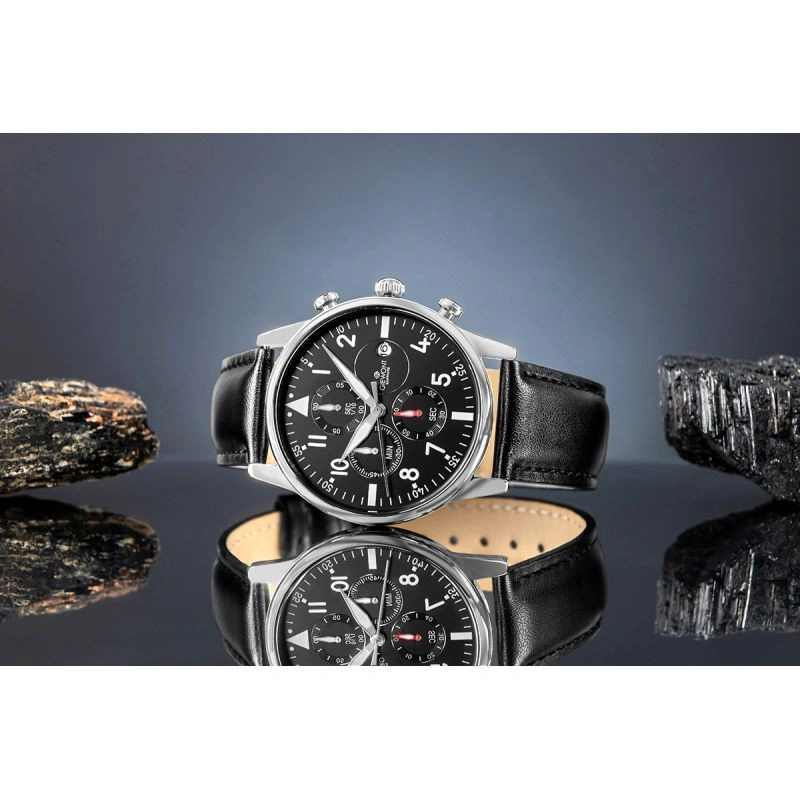 Zegarek Męski Giewont GW5630-A2 to wyjątkowe połączenie lotniczej stylistyki, funkcjonalności oraz zdecydowanego, męskiego charakteru — model stworzony dla osób ceniących wyrazisty design i pełną czytelność w każdych warunkach. Jego tarcza przyciąga uwagę dużymi, kontrastowymi cyframi arabskimi oraz charakterystycznym trójkątnym znacznikiem na godzinie 12, które nadają zegarkowi autentyczny, pilotowy charakter. Trzy precyzyjne subtarcze oferują funkcje chronografu, takie jak pomiar minut, sekund oraz 1/10 sekundy, dodając mu sportowego temperamentu i technicznej głębi. Wytrzymałe szkiełko szafirowe skutecznie chroni tarczę przed zarysowaniami, gwarantując zachowanie idealnego wyglądu przez długi czas, nawet przy intensywnym użytkowaniu. Koperta o eleganckim wykończeniu doskonale komponuje się z miękkim, skórzanym paskiem, który zapewnia komfort i świetne dopasowanie do nadgarstka. Funkcjonalność modelu podkreśla również praktyczny datownik na godzinie 3, zwiększaj