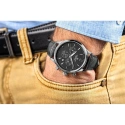 Řemínek tohoto modelu se vyznačuje jedinečnou kombinací kůže a barvy, které společně vytvářejí pohodlnou a odolnou konstrukci. Měkká kůže mu dodává elegantní, moderní vzhled a zajišťuje dokonalé padnutí a odolnost vůči každodennímu nošení. Díky této kombinaci je řemínek lehký, příjemný na dotek a nezpůsobuje nepohodlí ani při dlouhodobém nošení. Černá barva dodává hodinkám univerzálnost a podtrhuje jejich mužný charakter, přičemž dokonale ladí s jejich moderním designem. Jedná se o řešení pro muže, kteří ocení nejen styl, ale také pohodlí a funkčnost v té nejlepší kvalitě.