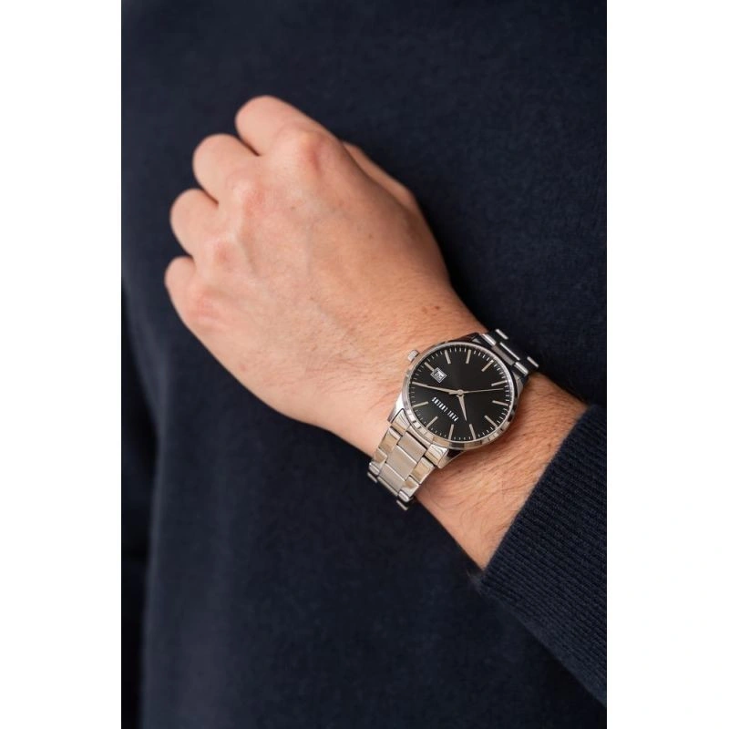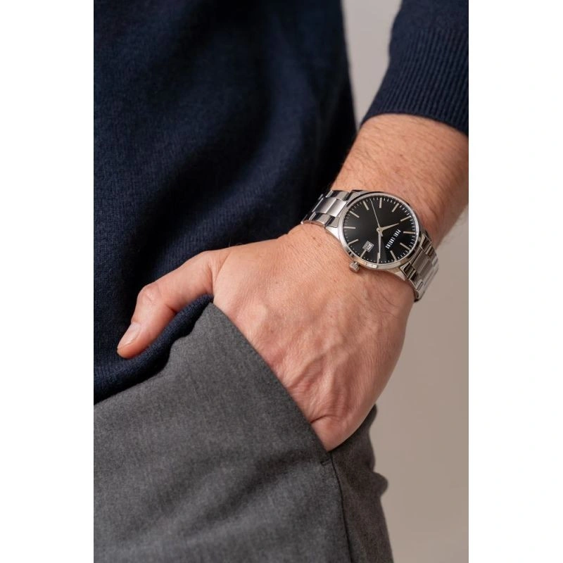 Model s ukazatelem dne v měsíci, elegantním stříbrným náramkem a černým ciferníkem vyzařuje mužný styl a vytváří jedinečnou kompozici, díky níž vyniknete v každé společnosti. Nejsou to jen hodinky, je to manifest vašeho vytříbeného vkusu, který přitahuje pohledy a budí respekt v každé situaci.