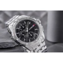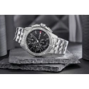 Stříbrný plášť obklopuje černý ciferník s jedinečnou strukturou, kde jemné linie mezi indexy dodávají ciferníku hloubku a charakter, čímž celé hodinky získávají trojrozměrný efekt. Jedná se o detaily, které podtrhují preciznost zpracování a dávají hodinkám vyniknout. Náramek je navíc skutečným uměleckým dílem, kombinuje dvě povrchové úpravy - kartáčovanou a leštěnou - které dodávají celým hodinkám jedinečný styl. Toto spojení textur vytváří výrazný kontrast, který přitahuje pohled a dodává hodinkám další hloubku a dynamiku. Stříbrné indexy a ručičky vyplněné černou barvou harmonicky splývají s ciferníkem a vytvářejí kontrast, který zajišťuje čitelnost a třídu za každého světla. Stříbrná sekundová ručička dodává hodinkám elegantní dynamický nádech.