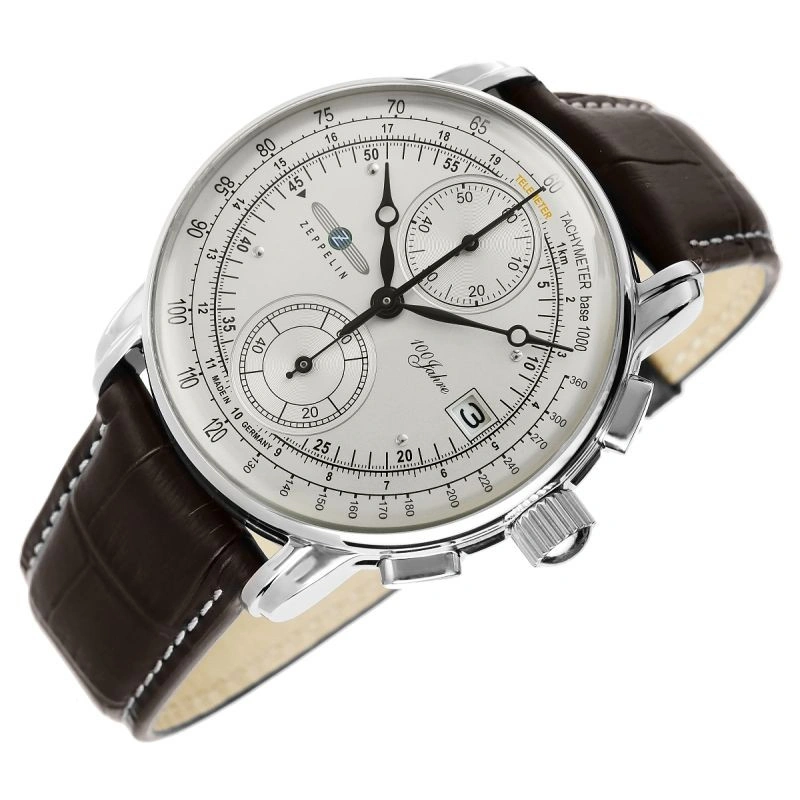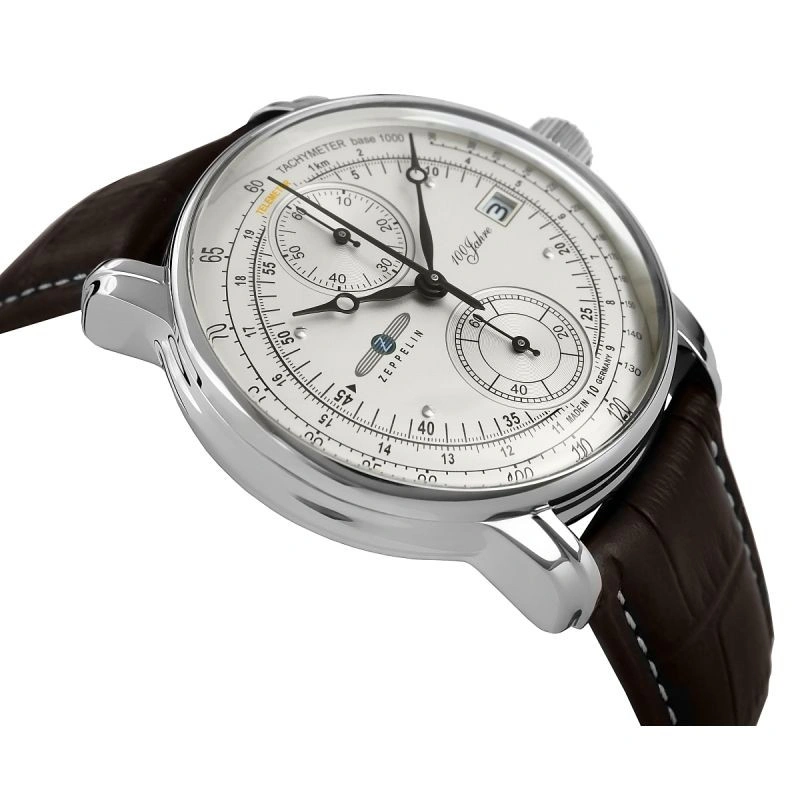 Letecké hodinky 100 Jahre Chronograph 8670-1 z limitované edice vytvořené u příležitosti 100. výročí založení legendární společnosti Zeppelin. Tento speciální výroční model pro muže se vyznačuje elegantním designem, který podtrhují jemné černé akcenty dodávající hodinkám sofistikovaný nádech. Hodinky jsou vybaveny funkcemi, jako je chronograf pro přesné měření času a data, telemetr pro měření vzdálenosti na základě časového rozdílu mezi jevy a tachometr.