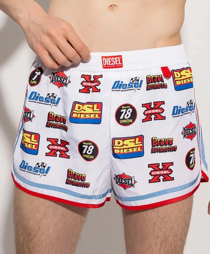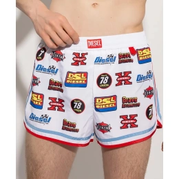 Bílé koupací šortky "Reef" značky Diesel. Tento pár se zapíná na šňůrky a má elastický pas, vícebarevný potisk loga a kapsu na zip.Materiál: 100% Polyester