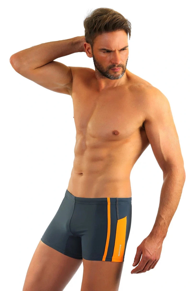 Pánské plavky s nohavičkou mladistvého střihu z kolekce Sesto Senso. Plavky jsou v černé barvě a zdobené jemnou kontrastní proužkem přes boky. Velmi oblíbený střih. V pase mají širokou gumu s provlečenou tkaničkou v tunýlku pro lepší úpravu velikosti. Přední díl je cely podšitý, aby neprosvítal. Na levém boce při okraji je natištěný nápis s logem výrobce.