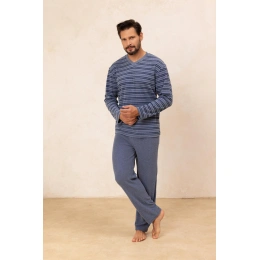 Pánské pyžamo 490 BIG J/25 značky Regina je klasickou zimní nabídkou vyrobenou výhradně z vysoce kvalitní froté bavlny. Tričko s dlouhými rukávy má posádkový výstřih a módní pruhovaný vzor, který dodává kompletu lehce sportovní, moderní nádech. Soupravu doplňují dlouhé jednotné kalhoty rovného střihu – pohodlné a přizpůsobené pro každodenní nošení. Měkký froté úplet poskytuje teplo a pohodlí, takže je tato souprava ideální volbou pro chladnější večery a zimní noci.