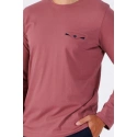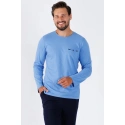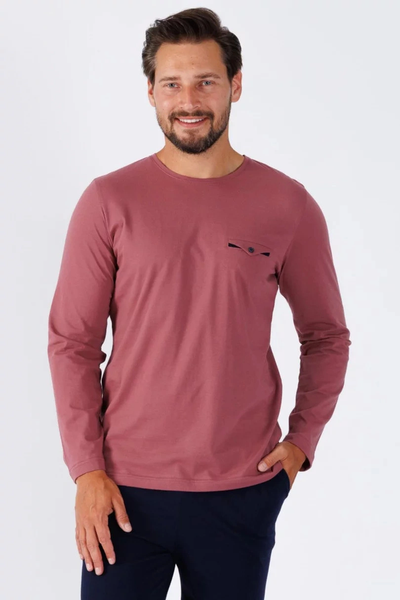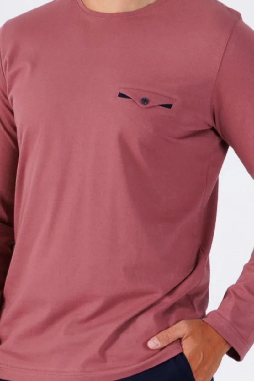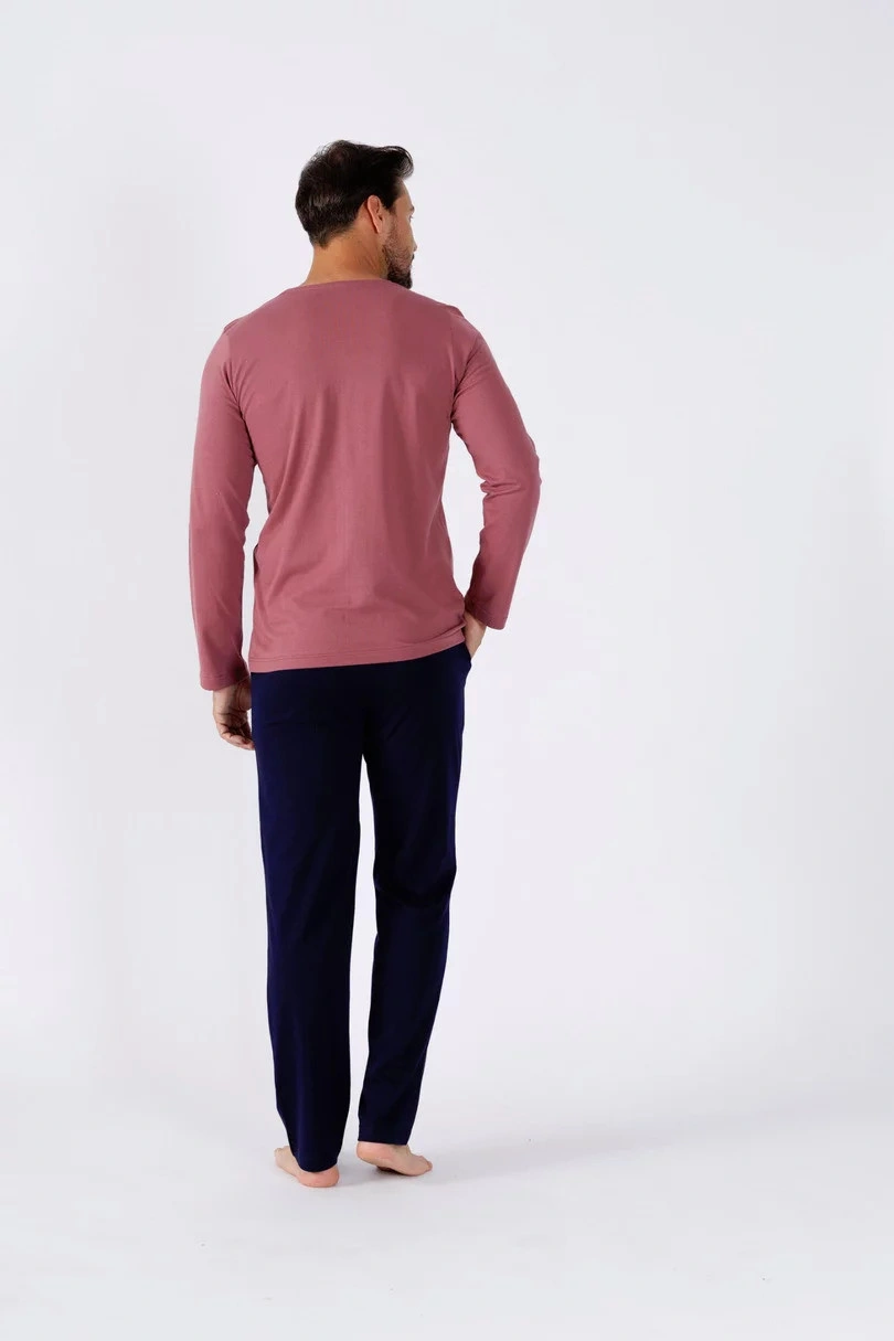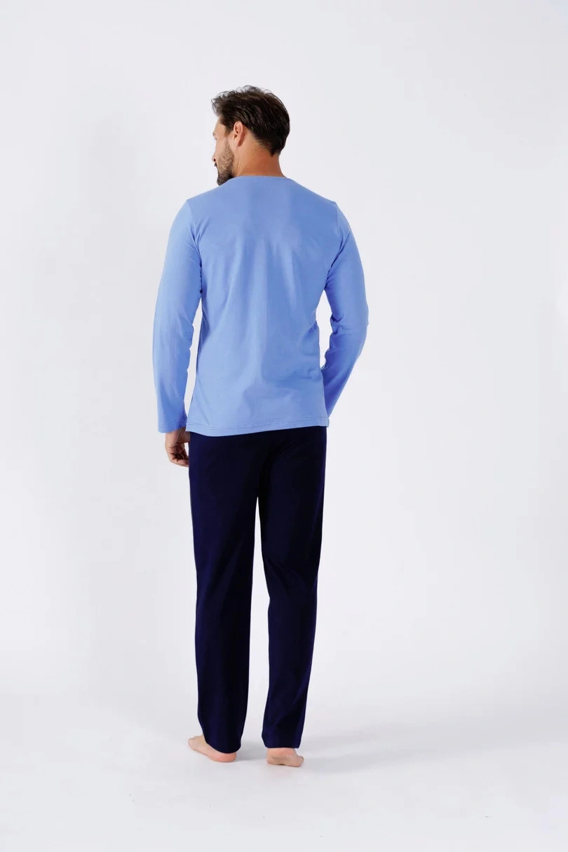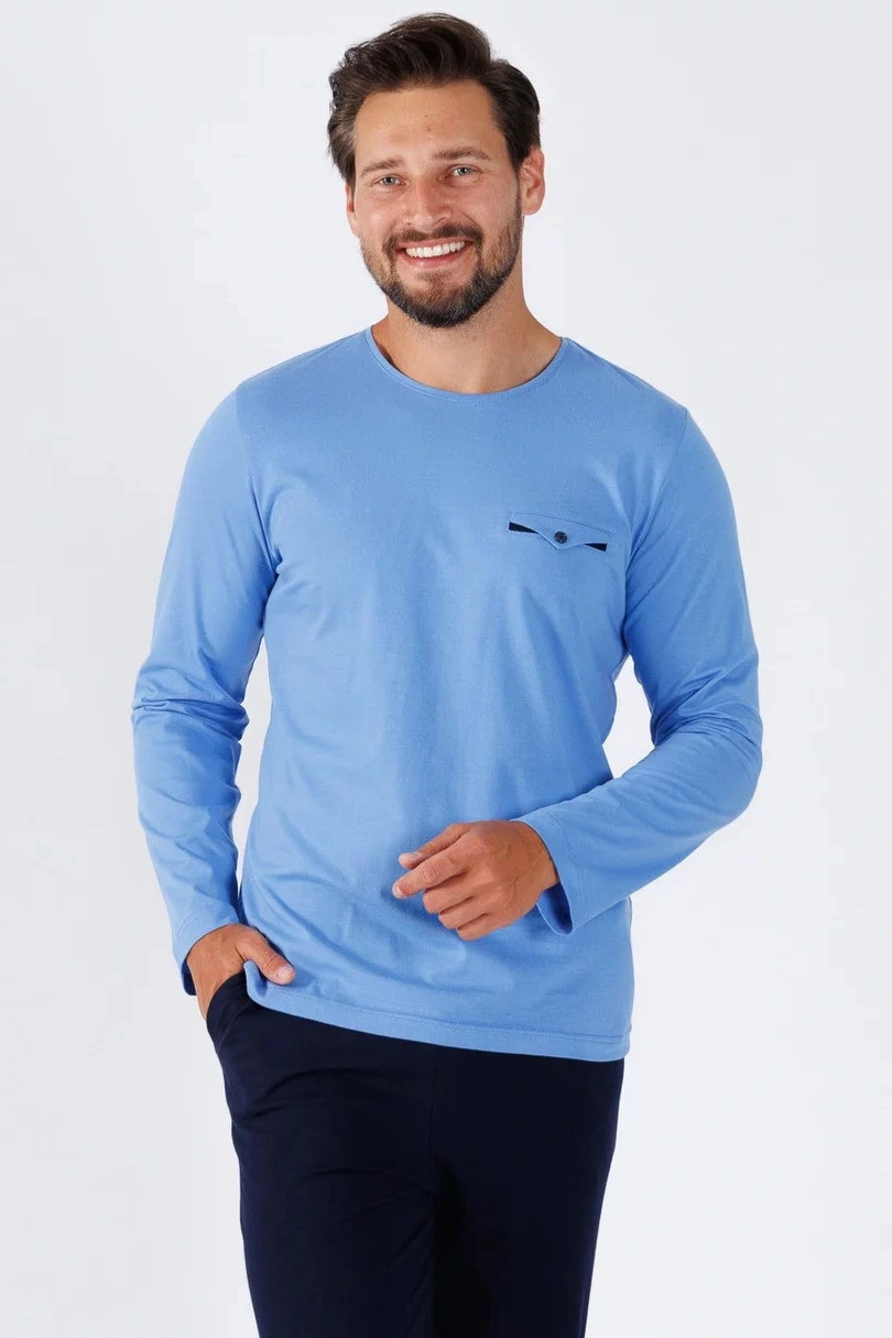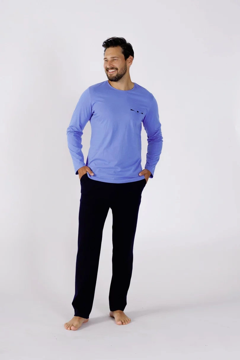 Pánské pyžamo z vysoce kvalitní bavlny, blůza s dlouhými rukávy a kulatým výstřihem, kapsička na hrudi, dlouhé rovné kalhoty.