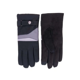 Elegantní pánské rukavice z příjemného materiálu. Ideální na zimu. Vrchní část je vyrobena z hladkého materiálu, spodní část je semišová. Rukavice jsou zdobeny pruhy materiálu v kontrastní barvě. Na manžetě je navíc ozdobné tlačítko. Na vnitřní straně je horní část rukavice dvouvrstvá. Na špičkách obou ukazováčků je našitý materiál, který umožňuje používat dotykové obrazovky.