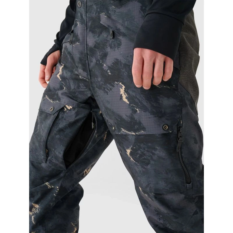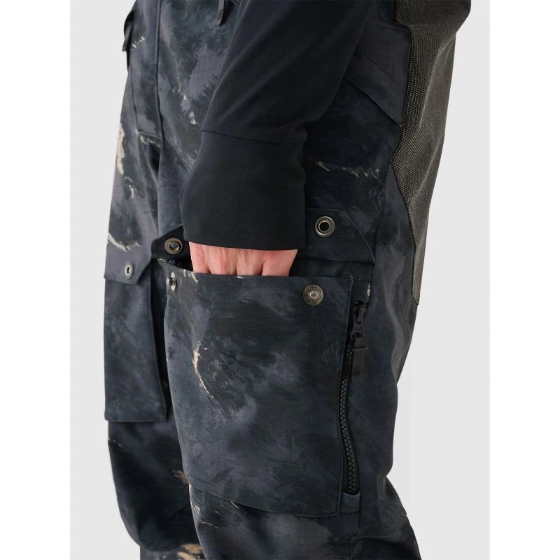 Pánské zimní snowboardové kalhoty mají 2 kapsy na zip na bocích a další otevřené cargo kapsy na nohaVíce