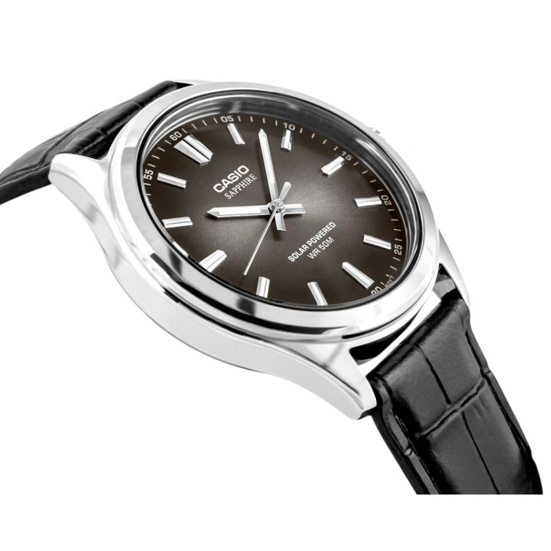 Využijte sílu slunce s analogovými hodinkami CASIO Solar. Díky solárnímu napájení se nemusíte starat o baterie - solární panel nabíjí hodinky světlem a při plném nabití jim poskytuje až 4 měsíce provozu. Ciferník v odstínu sytě černé barvy připomíná rozptýlené sluneční světlo a dodává celkovému vzhledu charakter a hloubku. Safírové sklíčko s antireflexní vrstvou nejen chrání před poškrábáním, ale také zvýrazňuje hloubku barev ciferníku a udržuje jej čitelný i při ostrém světle. Vodotěsnost 50 metrů poskytuje ochranu pro každodenní používání - nemusíte se obávat kontaktu s vodou, deště nebo mytí rukou. Jedná se o precizně zpracovaný model, který kombinuje moderní technologie s klasickou mužskou elegancí.