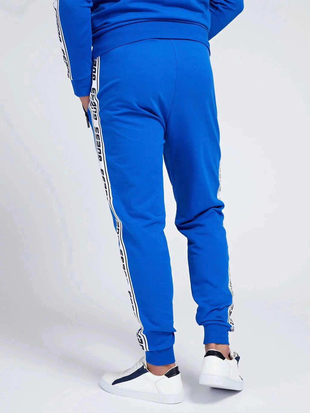 - ozdobné černo-bílé lemování na vnější straně nohavic, s nápisem Guess