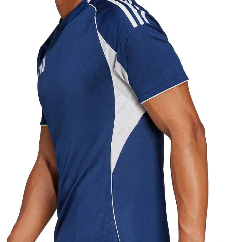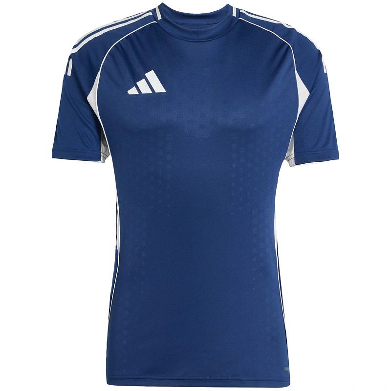 Pánské tričko adidas Tiro 25 Competition Match v tmavě modré barvě JF6079 Toto pánské tričko značky adidas je ideální na fotbalové zápasy, má úzký střih, technologii Aeroready pro odvod přebytečné vlhkosti, boční panely se strukturou síťoviny, recyklovaná vlákna, logo s nanotransferem a vyraženou grafiku inspirovanou profesionálními kluby. Materiál: 100% recyklovaný polyester.