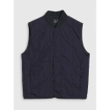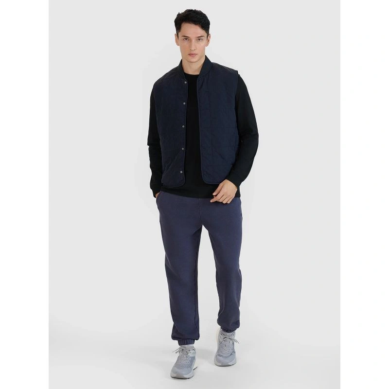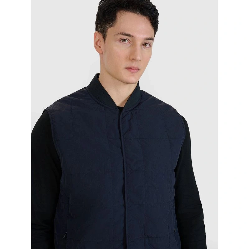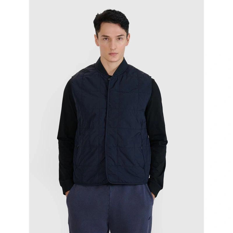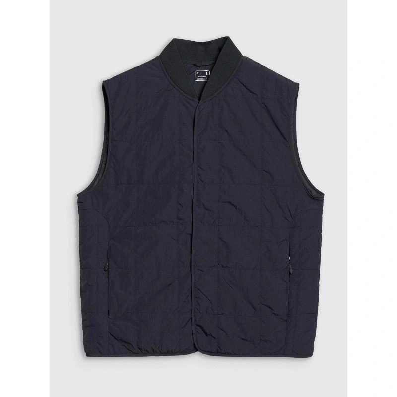 Bunda bez rukávů je vyrobena z odolného syntetického materiálu, který se snadno udržuje, má pravidelný střih, který se pohodlně přizpůsobí postavě, a standardní délku sahající až k bokům.