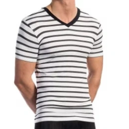 Triko 58260Z3 má výstřřih do V, na bocích rozparky a krátké rukávy zdobí žlutý lem a nápis Calvin Kl