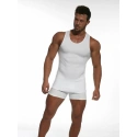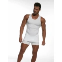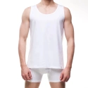 Pánský nátělník. Má polokulatý výstřih a dvojité švy na ramínkách. Lehce obepíná tělo a nestahuje.