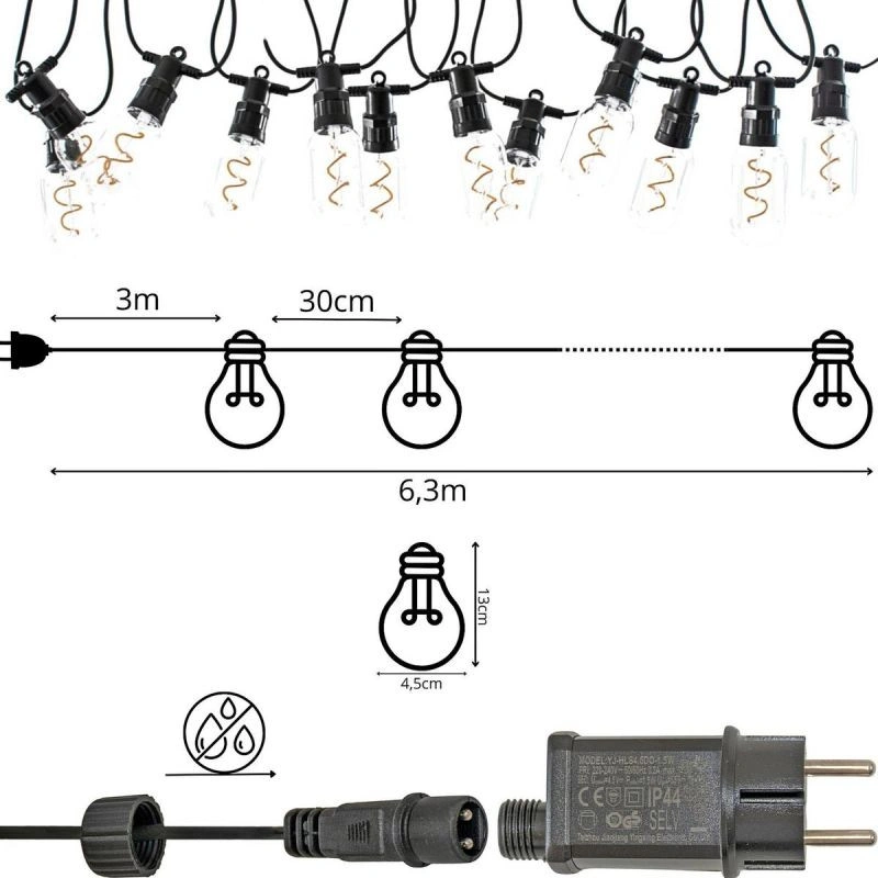 Celková délka girlandy 6,3 metru a rozteč 30 cm ji předurčují k různým aranžmá - můžete ji zavěsit podél terasy, omotat kolem altánu, připevnit k pergole nebo natáhnout mezi stromy. Optimální rozteč 30 cm mezi žárovkami zajišťuje rovnoměrné osvětlení, které dodá vašemu prostoru harmonický a elegantní vzhled.