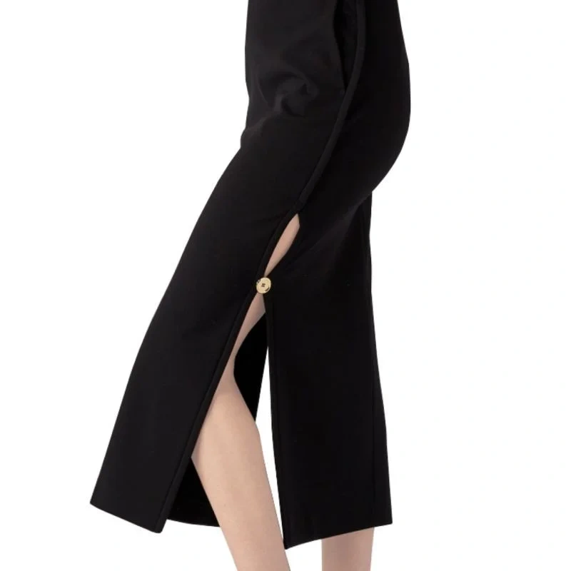 - Vysoký střih, kapsy na bocích a dvojitý boční rozparek zapínaný na kovové knoflíky.