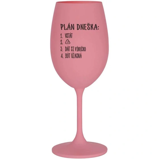 Vinná růžová sklenice s originálním motivem PLÁN DNEŠKA - VSTÁT je krásným a osobitým dárkem, které ale využijete i Vy sami třeba ve chvílích, kdy si budete chtít zpříjemnit náročný den. Tyto originální vinné sklenice jsou totiž nejen pro výjimečné události, ale i pro běžné večery, které si chcete zpříjemnit sklenkou dobrého vína. Jistě proto potěší každého milovníka vína, i toho, kdo si umí svůj život vychutnat plnými doušky.
