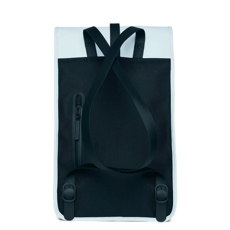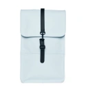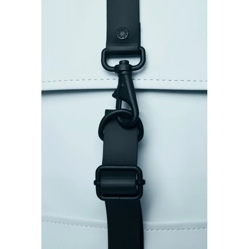 Silueta batohu je klasikou značky Rains, vyznačuje se vyčnívající klopou a středovým popruhem se zapínáním na karabinku.