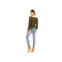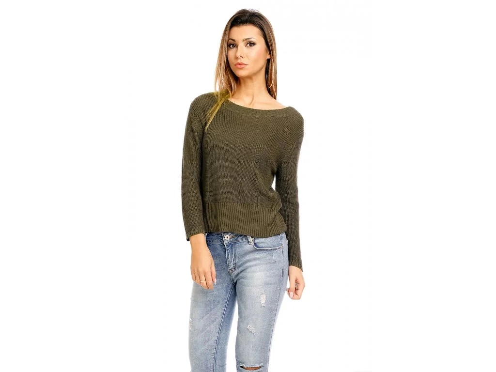 Svetr je volnějšího střihu se šněrováním na zádech.