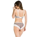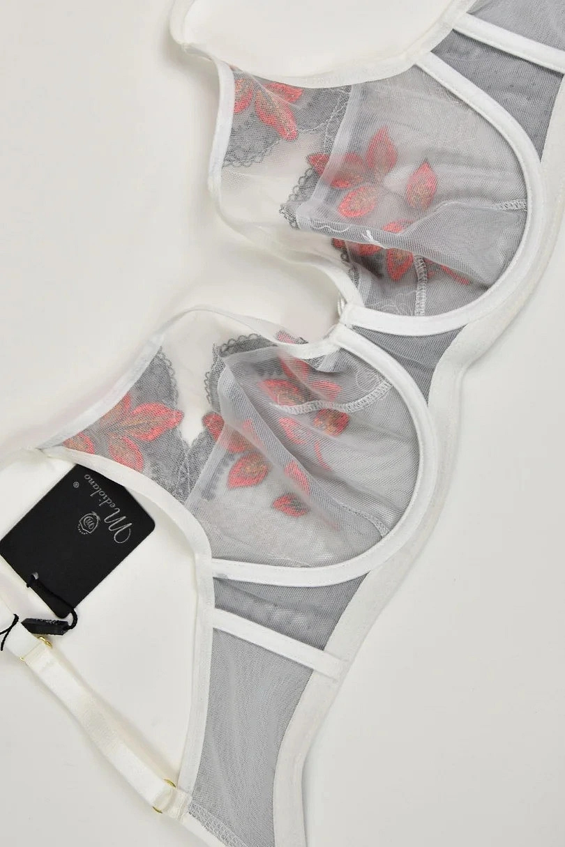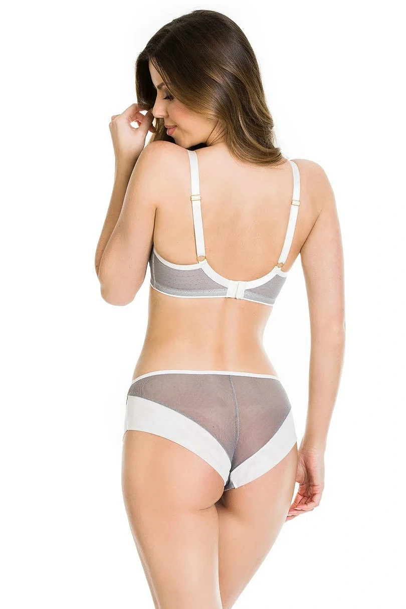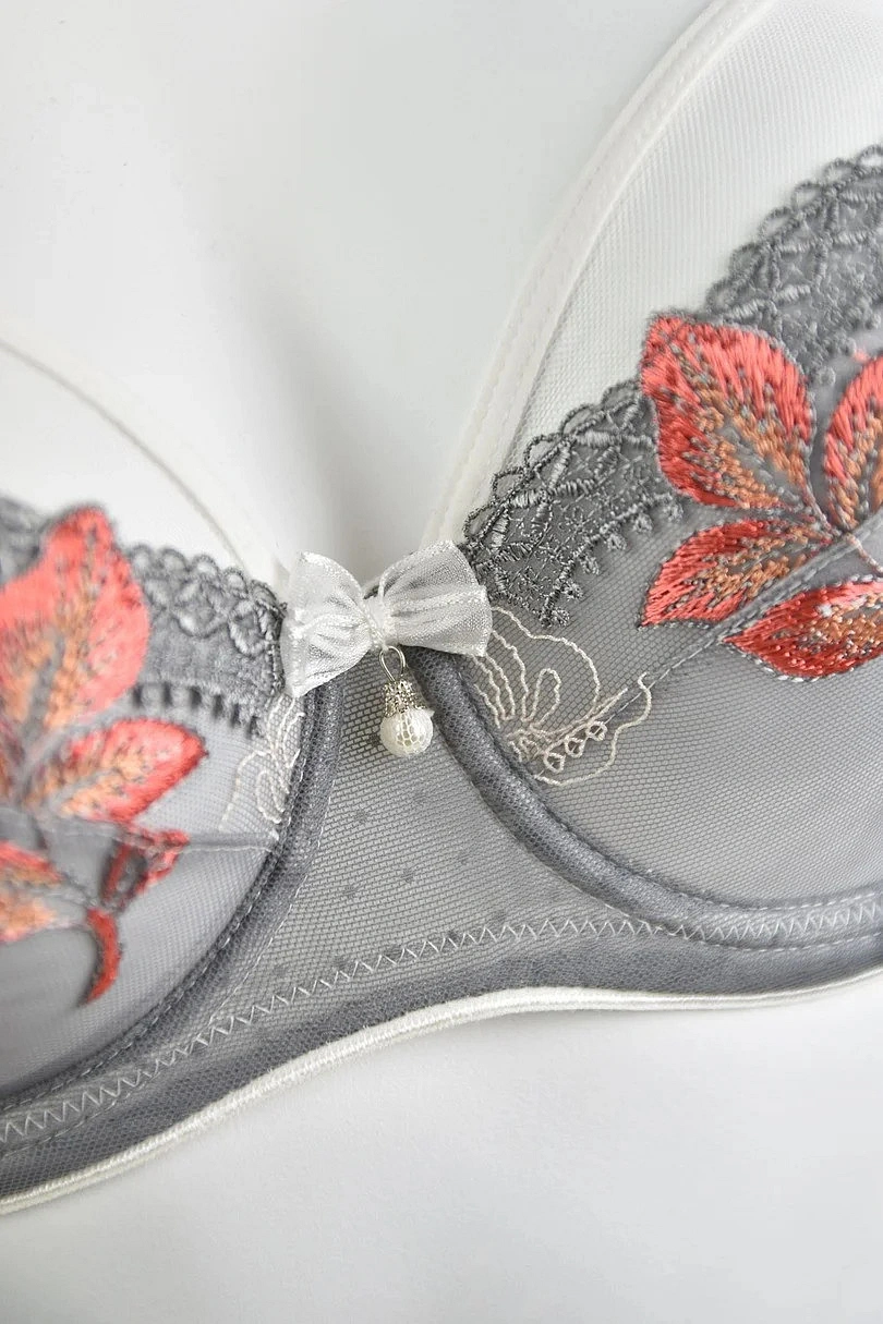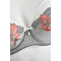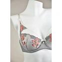 Spodní část košíčku je vyrobena ze síťoviny, horní část je vyšívaná oranžovými květy na šedém pozadí, ramínka a pásky jsou v bílé barvě. Stabilní síťovaná podprsenka poskytuje maximální oporu poprsí.