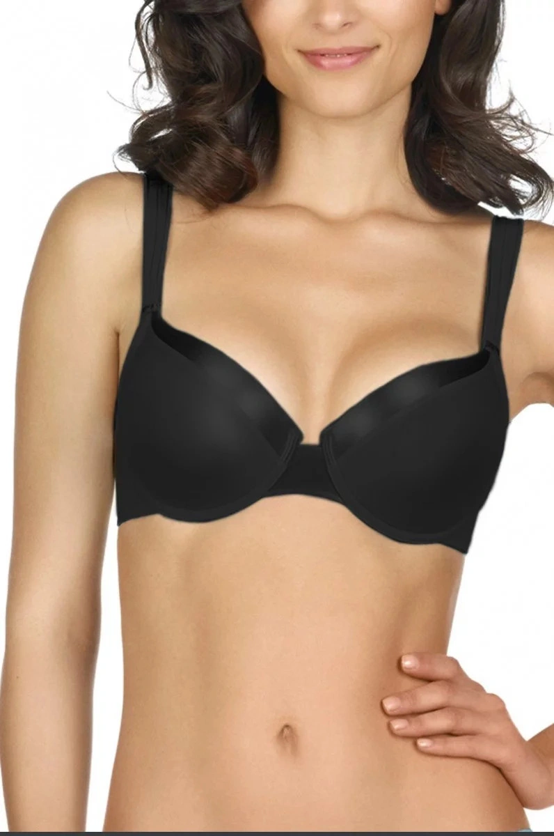 Podprsenka push-up s hladkými košíčky laděná v černé barvě. Zpevněná kosticemi. Vycpávky je možné vy