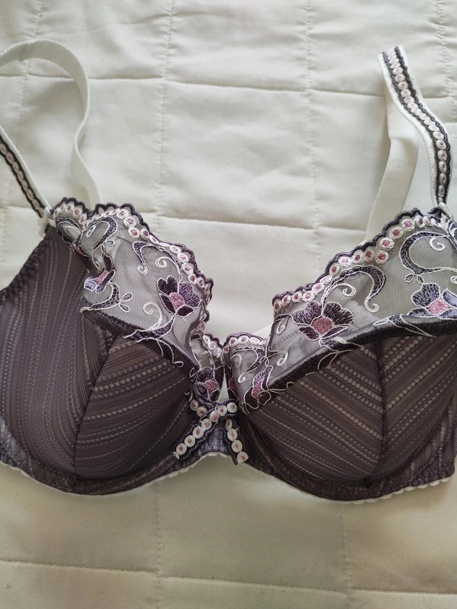 Elegantní měkká podprsenka v barvě ecru zdobená lesklou nití. Šálky se dvěma řezy: svislým a vodorov