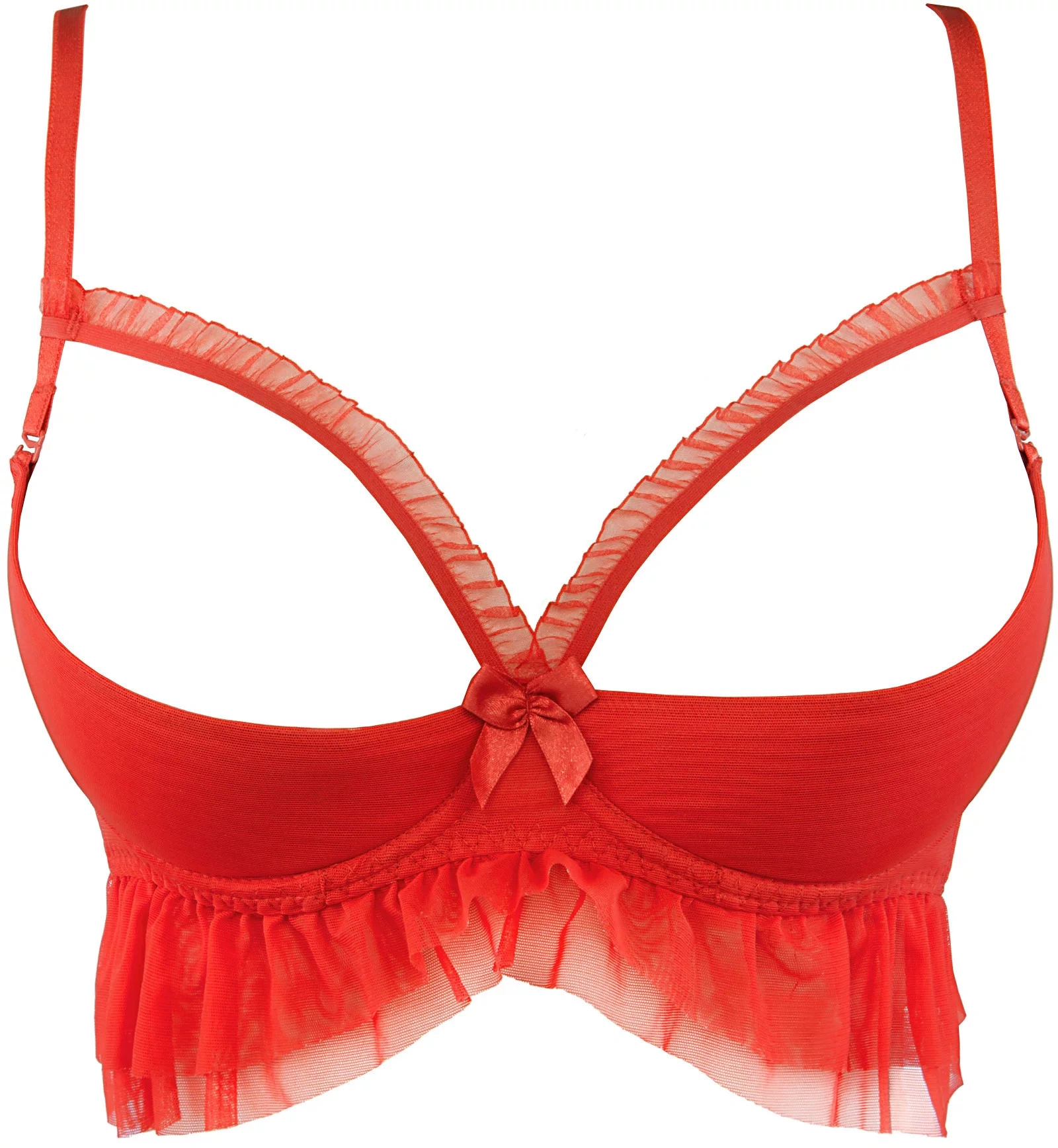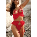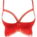 Podprsenka "Peek a boo" V-9971 v zářivě červené barvě okouzluje vzdušnými, hravými volánky, které jemně spadají přes poprsí a svůdně zvýrazňují jeho tvar. Zdánlivě nevinný půvab podtrhuje saténová mašlička mezi košíčky. Je to překvapivá, vášnivá nabídka, která rozproudí vaši představivost a zanechá ve vás neodolatelný pocit. Zvlášť když efekt umocníte podvazkovým pásem V-9972 a tangy V-9978.podprsenka s třístupňovým nastavitelným zapínáním na háčky a oka.