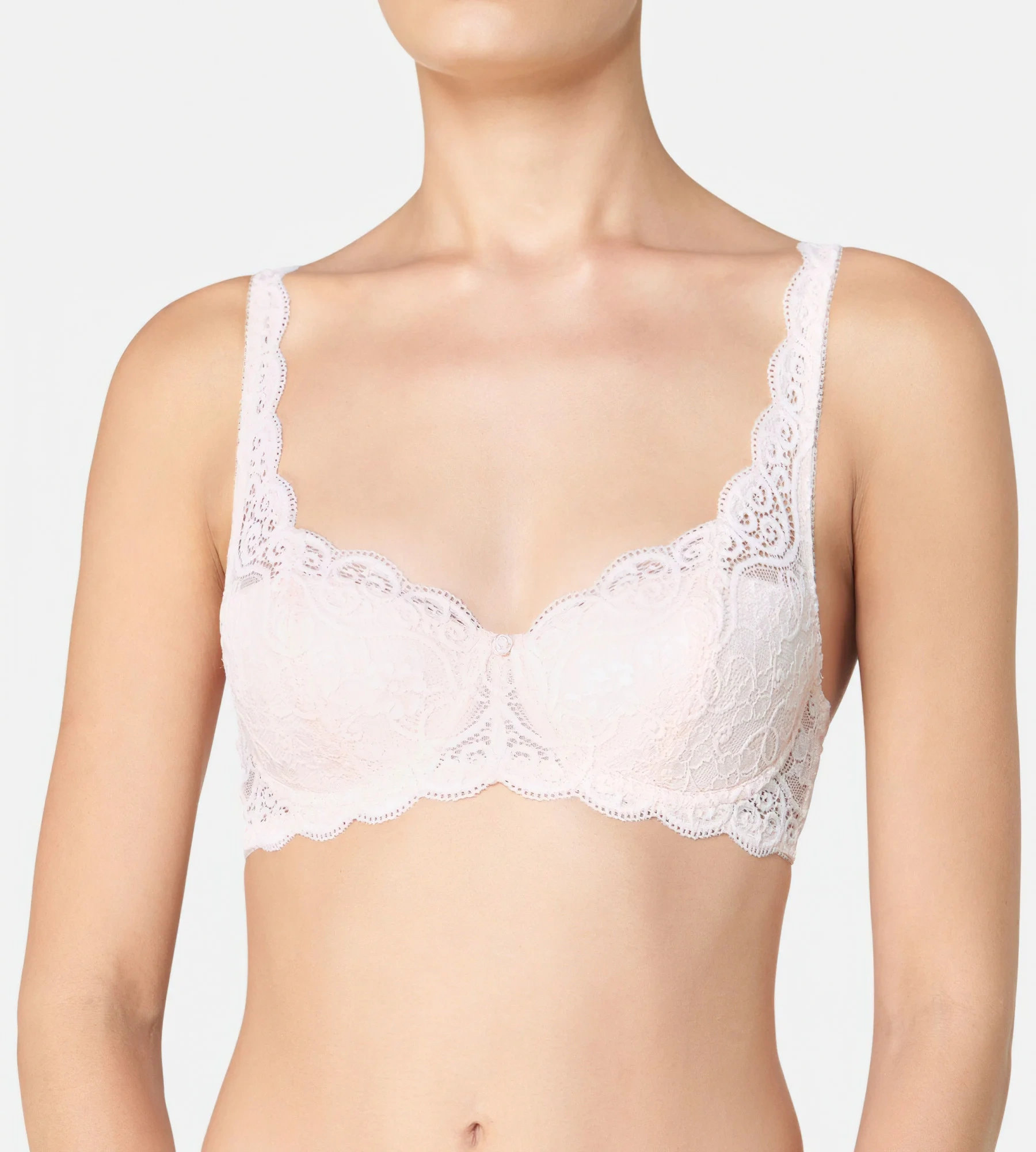 Měkká podprsenka s kosticí. Síťované košíčky pokryté bohatou krajkou, góray z béžového tylu zakončen