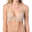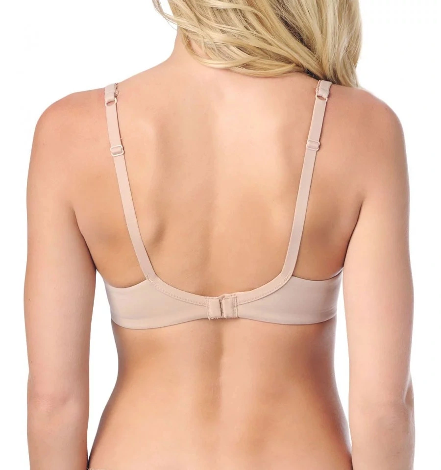 Vyztužená podprsenka s hladkými košíčky se všitou jemnou krajkou ve výstřihu do velikosti E. Zapínání na dva háčky.