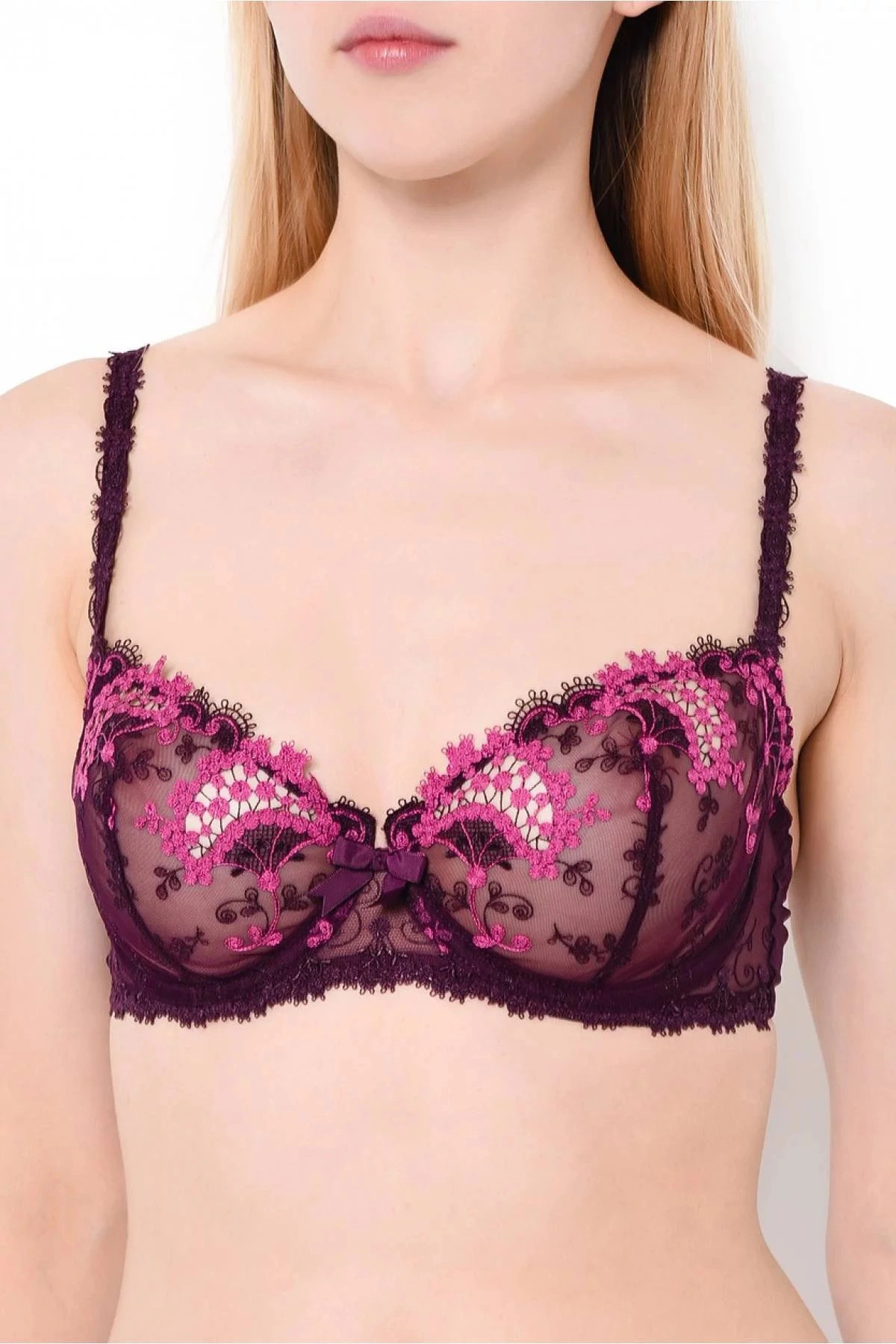 Měkká dámská podprsenka s kosticemi. Podprsenka je vyrobená ze síťoviny s efektní výšivkou v hluboké