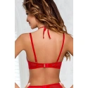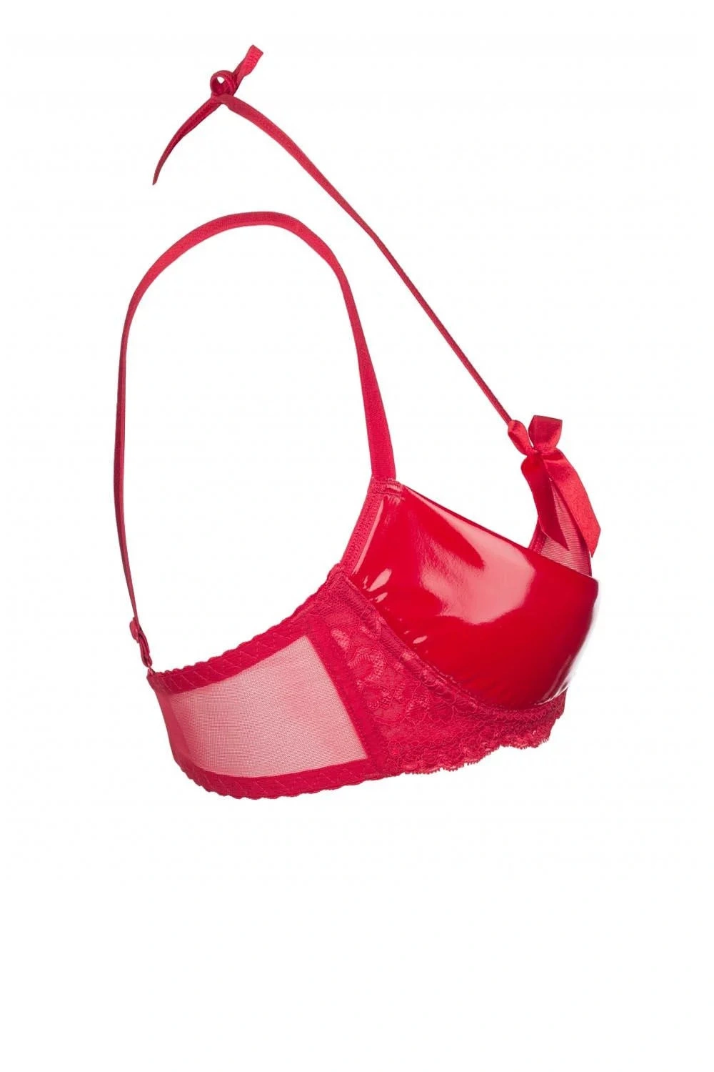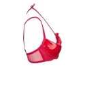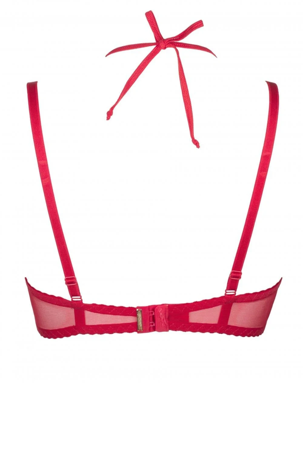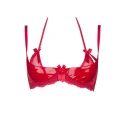 Červená polo podprsenka Rouge, ze které přímo sálá a čiší vášnivý sexappeal, dokonale podtrhne krásu vašeho těla a přitáhne žádoucí pohledy. Nikdo z vás už neodtrhne oči! Podprsenka má lesklé košíčky. Můstek (střed podprsenky) a boky jsou z jemného tylu. Zadní díl je vyrobený z jemného tylu. Na kráse dodávají modelu hravé mašličky. Model má boční kostice a zavazuje se za krkem. Druhá ramínka je možné nastavit, ale nelze je odepnout. Zapínání je na dva háčky s třístupňovou možností nastavení velikosti obvodu. Souprava vytvoříte společně s tanga string a podvazkovým pásem Rouge.