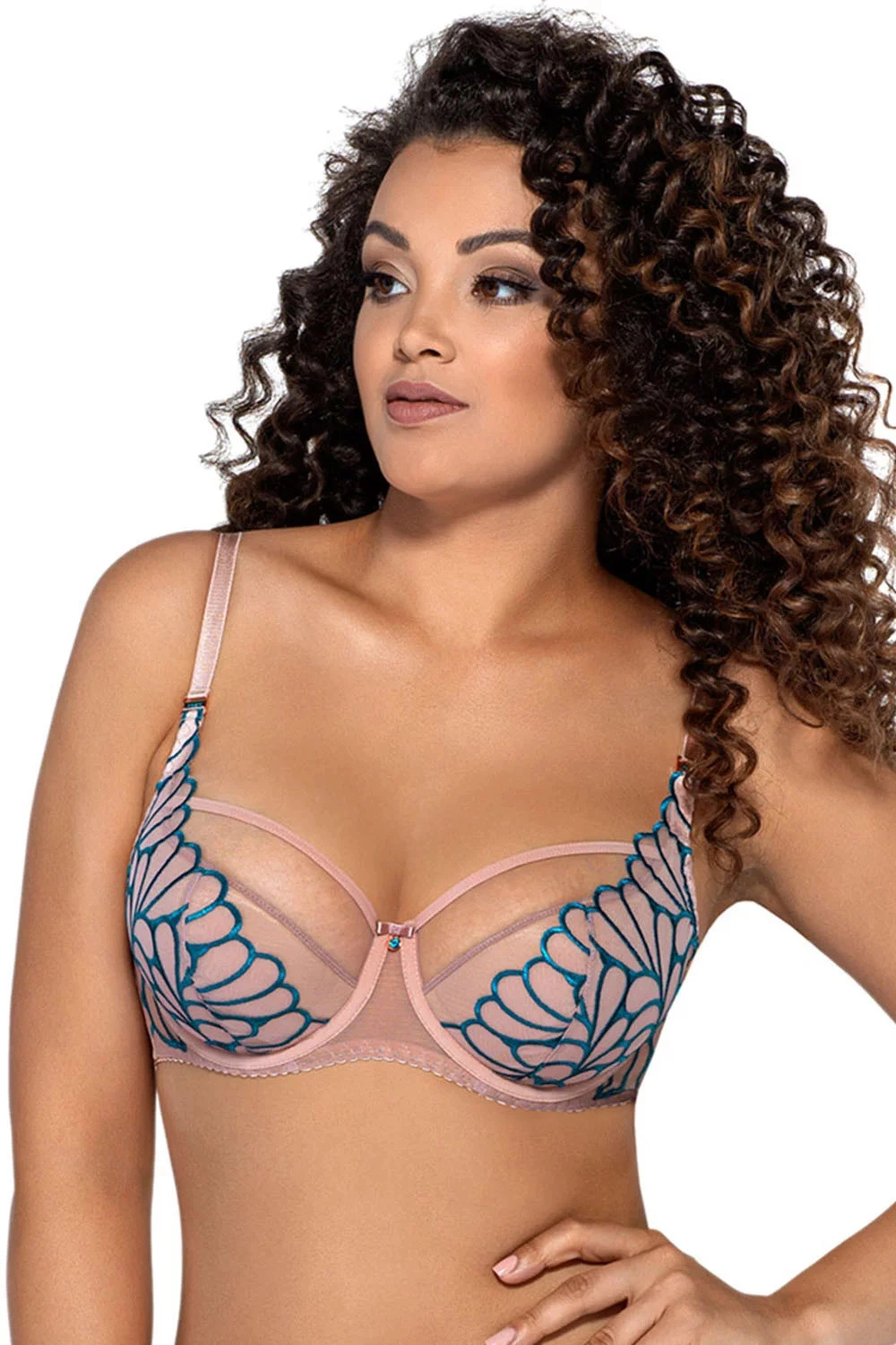 - košíčky pokryté jemným tylem s poutavou tyrkysovou výšivkou