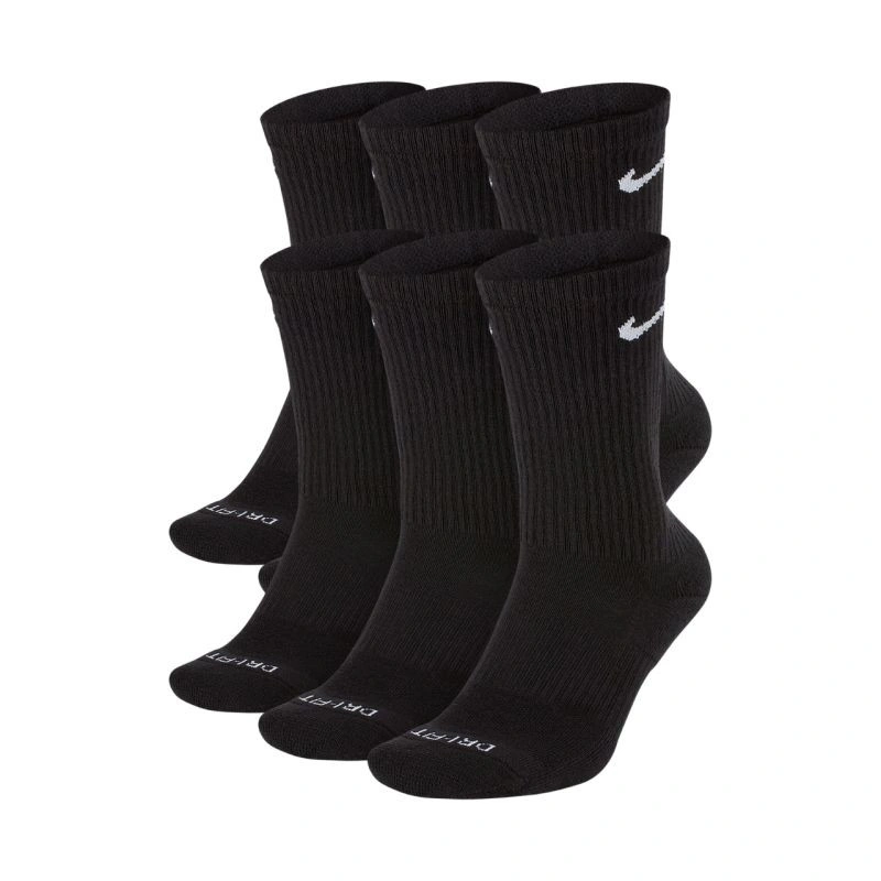 Ponožky Nike Everyday Plus Cush 6 párů černé SX6897 010. Tyto ponožky Nike v délce 1/3 lýtka vám pomohou udržet pohodlí při fyzické aktivitě. Ergonomický design a použití odolných, pružných materiálů. Technologie Dri-FIT zajišťuje prodyšnost a odvádí vlhkost. Speciální popruhy těsně přiléhají ke klenbě chodidla a poskytují oporu. Polstrování v oblasti přední části chodidla a paty. Horní manžety zabraňují vyhrnování ponožek. Horní panely jsou vyrobeny z jemnější příze pro lepší ventilaci. Zesílené oblasti paty a prstů zvyšují odolnost. 6 párů součástí balení. Materiál: 61-67 % bavlna, 30-36 % polyester, 2 % spandex, 1 % nylon.