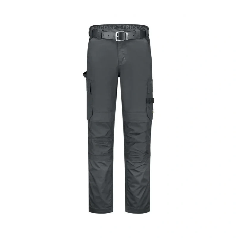 Unisex kalhoty elastický pas, multifunkční kapsy, reflexní prvky, kolena zesílená extra pevným materiálem CORDURA®, možnost prodloužení nohavic, vhodné pro kolenní chrániče T90, velikosti 45, 47, 49, 51, 53, 55 jsou prodloužené, pásek není součástí sady, kód produktu Tricorp: 502021