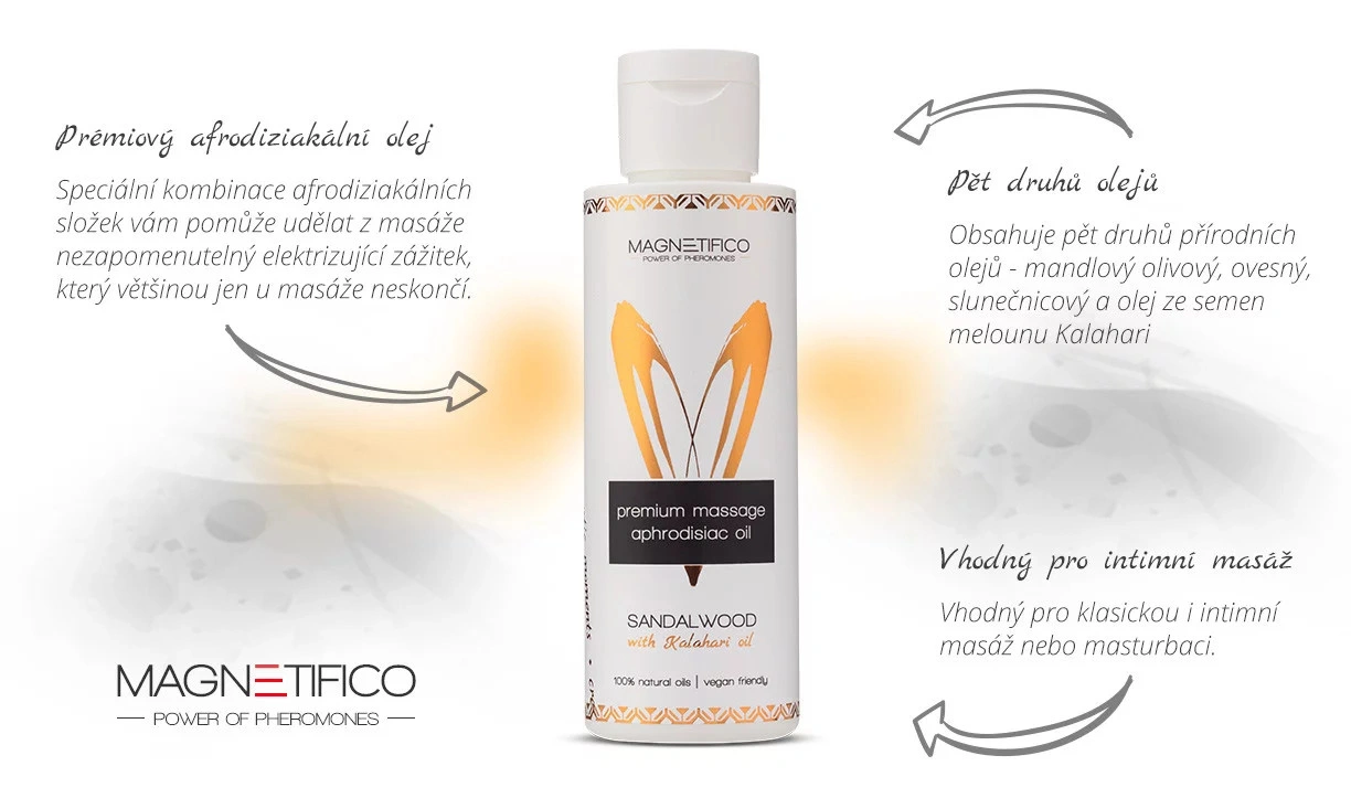 Nechte se hýčkat a prožijte nezapomenutelné chvíle plné vzrušení i relaxace. Tento masážní olej z řady MAGNETIFICO – power of pheromones byl navržen tak, aby zajistil optimální kluzkost a nebyl zároveň příliš mastný a přirozeně se tak vstřebal do pokožky. Speciální kombinace afrodiziakálních složek vám pomůže udělat z masáže nezapomenutelný elektrizující zážitek, který většinou jen u masáže neskončí.