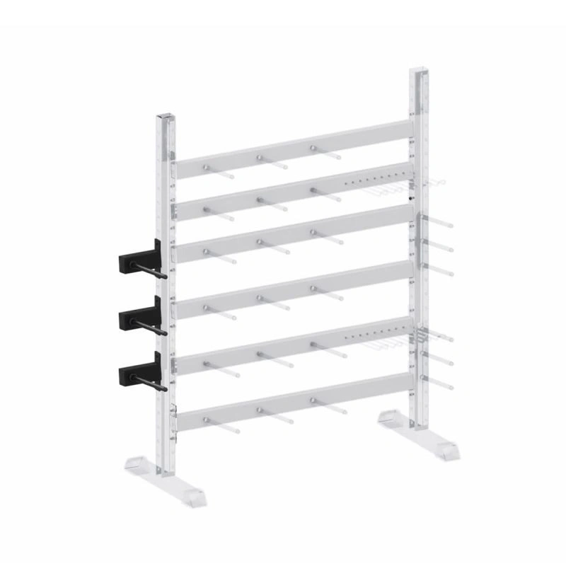 Dodatkowy uchwyt na talerze do modułowego stojaka na sztangi 22/24. Dzięki temu dedykowanemu rozwiązaniu, można przechowywać na stojaku modułowym na sztangi dodatkowe 8 szt talerzy 1.25 kg lub 2.5 kg lub 5 kg lub 4 szt 7.5 kg. Aby zamontować uchwyt potrzebujesz podstawowej wersji stojaka. Mocne strony stojaka modułowego na sztangi Profesjonalny, modułowy stojak służący do pionowego przechowywania sztang typu powergym oraz butterfly w siłowniach i klubach fitness. Ergonomiczna konstrukcja rozwiązania łączy w sobie funkcję stojaka na gryfy oraz wieszaka na obciążenie, skutecznie zastępując dwa pojedyncze akcesoria. Modułowy stojak na powergym to solidna stalowa konstrukcja nośna wykonana z metalowych profili grubości 3 mm. Trwałość połączenia poszczególnych elementów zapewniają śruby klasy 10.9, które poddane zostały procesowi galwanizacji. Dodatkowe pokrycie czarnym cynkiem zwiększa ich odporność na korozję, znacząco wydłużając żywotność sprzętu i zachowanie wysok