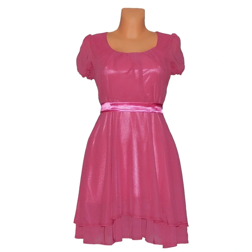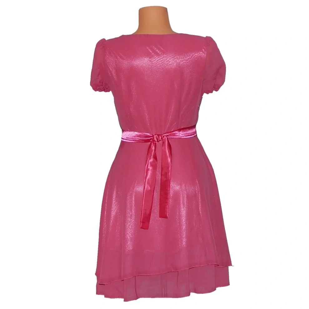 dámské šifonové šaty skvělé pro párty, ples, nebo maturitní ples. Sukně je ve střihu do A a je složena ze dvou vrstev, které na sebe ve spodní části nenavazují a budí tak dojem okvětních lístků. Rukávky jsou krátké v balonovém střihu. Na boku jsou šaty opatřeny zipem, pro jejich pohodlné oblékání. V pase lze šaty opatřit saténovou stuhou, která je součástí dodávky. Stuha opticky šaty přeřízne a zároveň dá vyniknout ženské siluetě. Krásné a romantické šaty pro každou společenskou událost.