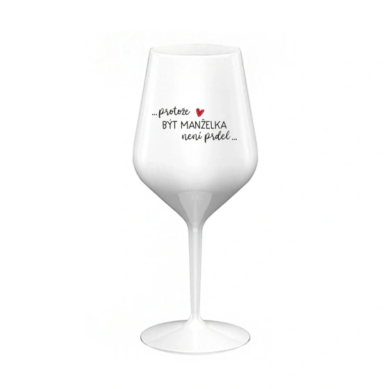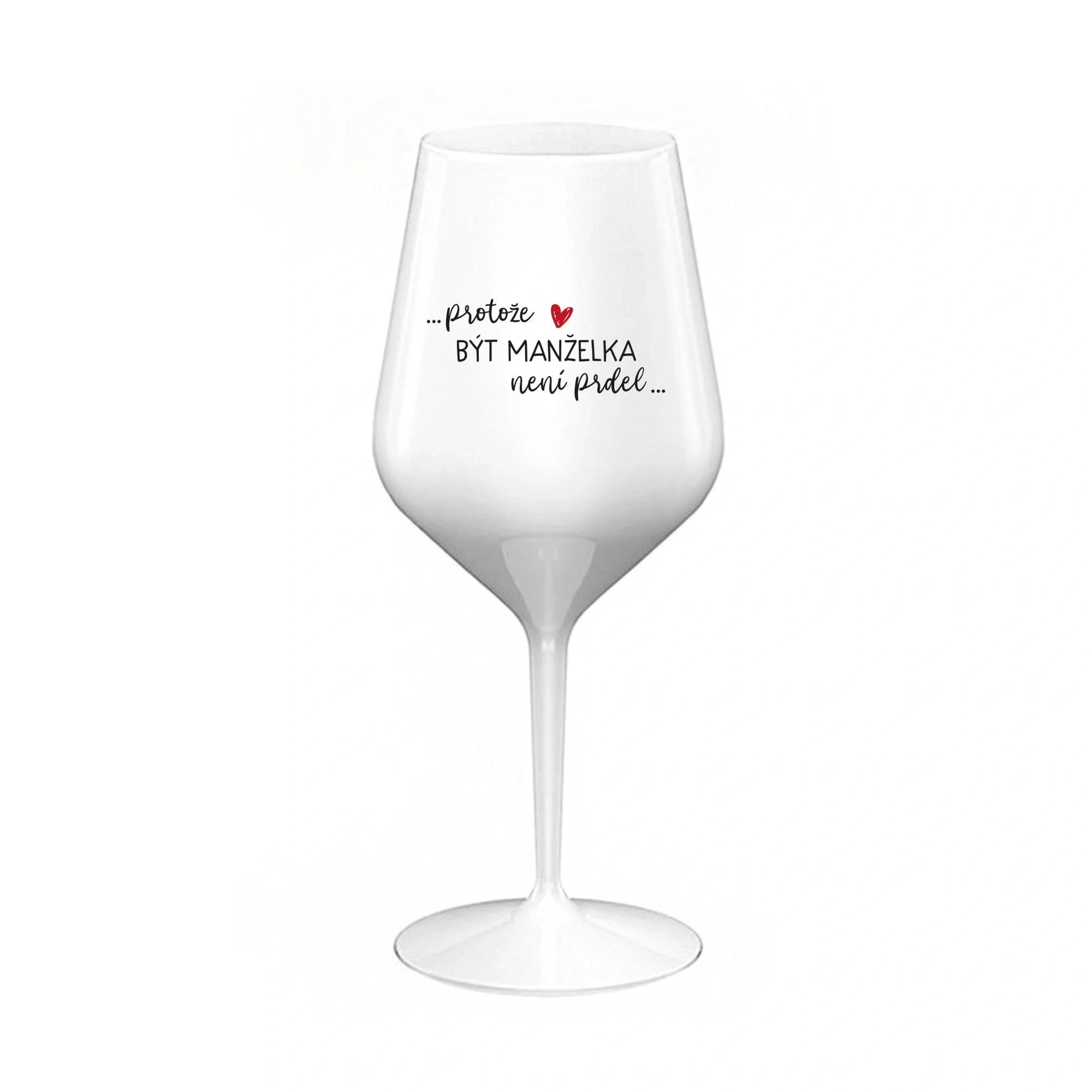 Nerozbitná bílá vinná sklenice s motivem PROTOŽE BÝT MANŽELKA NENÍ PRDEL je skvělá na zahradu, pláž, výlet, piknik a parádu udělá i při kempování. Jelikož je vyrobená z kvalitního polykarbonátu je de facto nerozbitná. Je to luxusní kousek, s nímž si víno můžete vychutnat prostě kdekoliv. Mají ergonomický tvar, který příjemně padne do ruky a protože je lehká, usnadňuje to její přenášení. Je snadno skladovatelná a lehce se čistí. Díky svému designu si s ní můžete vychutnat doopravdy kdekoliv bezproblémové pití výborného vína. Materiál PP. Vyrobené s láskou v ČR