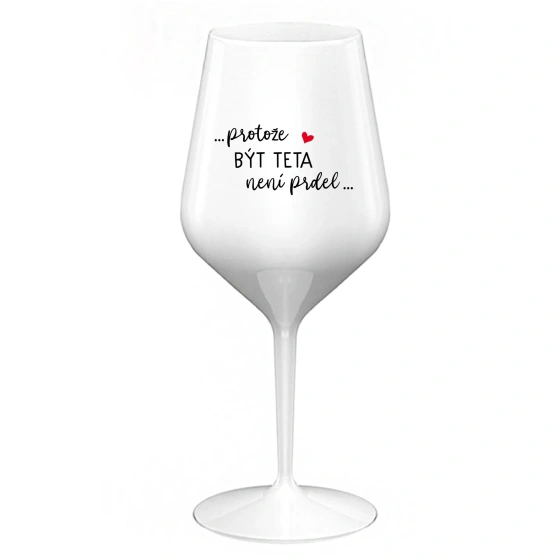 Nerozbitná bílá vinná sklenice s motivem ...PROTOŽE BÝT TETA NENÍ PRDEL... je skvělá na zahradu, pláž, výlet, piknik a parádu udělá i při kempování. Jelikož je vyrobená z kvalitního polykarbonátu je de facto nerozbitná. Je to luxusní kousek, s nímž si víno můžete vychutnat prostě kdekoliv. Mají ergonomický tvar, který příjemně padne do ruky a protože je lehká, usnadňuje to její přenášení. Je snadno skladovatelná a lehce se čistí. Díky svému designu si s ní můžete vychutnat doopravdy kdekoliv bezproblémové pití výborného vína.
