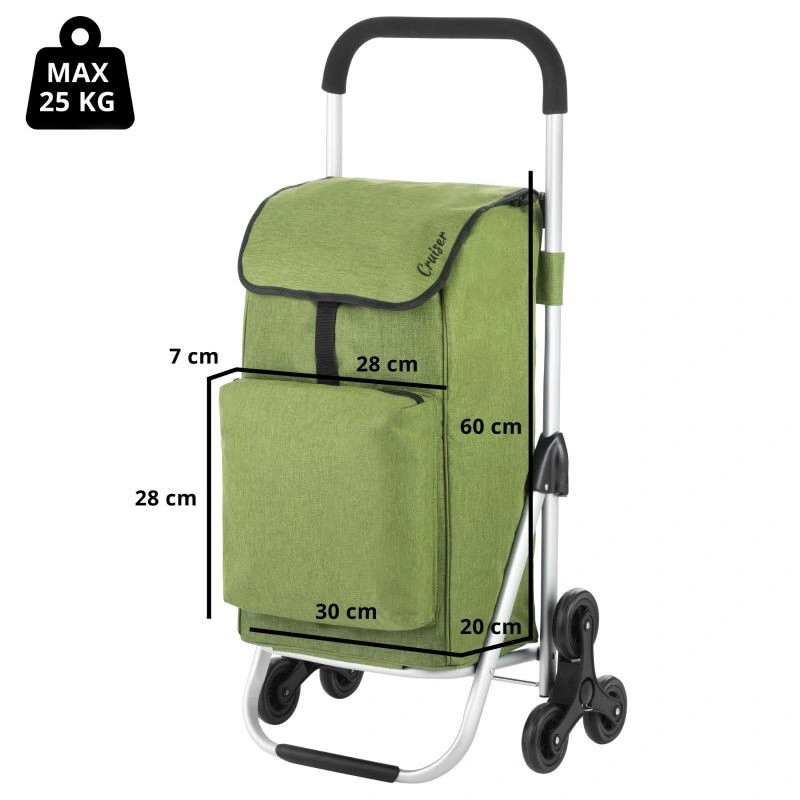 Objem vozíku Expert stairlift od společnosti Cruiser je 49 litrů, takže se do něj pohodlně vejde až 25 kg potravin. Přední kapsa má navíc 4litrovou termotašku, takže můžete nakupovat dlouho i v létě, aniž byste se museli obávat, že se produkty příliš zahřejí.